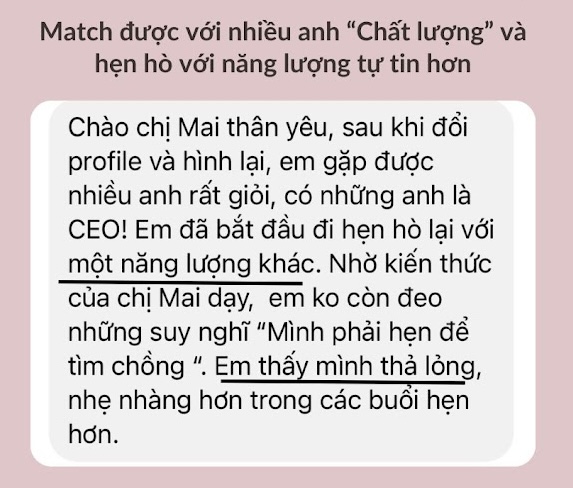 Nhưng điều quan trọng là, bạn không phải đặt tâm thế là đi hẹn hò để tìm được đúng người, mà đầu tiên là để bạn luyện tập kỹ năng hẹn hò, tán tỉnh để xây dựng sự kết nối thú vị.