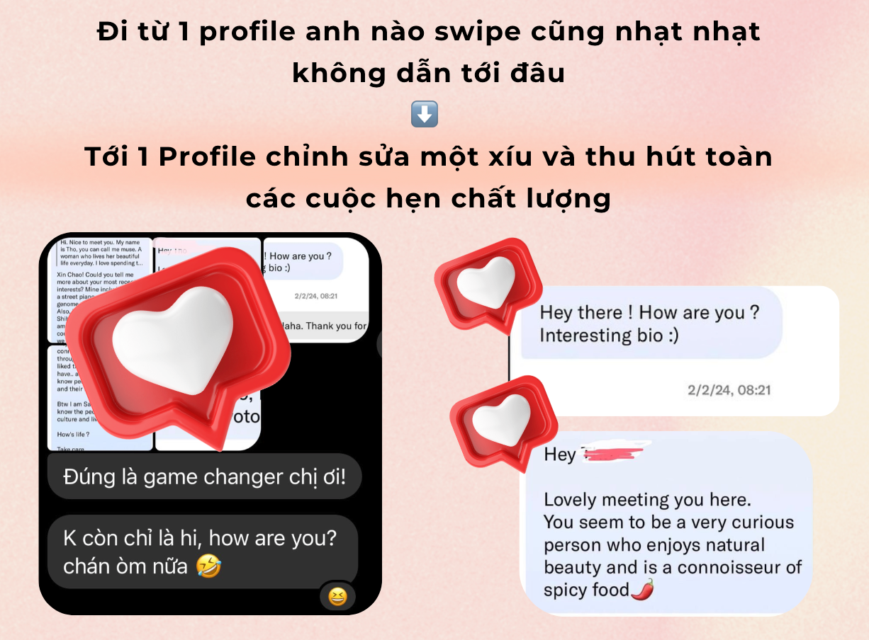 Hơn nữa, việc cài cắm đúng các từ khoá vào Profile cũng sẽ trở thành một “màng lọc” tự động loại bỏ những người không nghiêm túc và không phù hợp với giá trị của bạn, để bạn gặp đúng người ngay từ đầu, tránh lãng phí thời gian hay dính vào những mối quan hệ “cờ đỏ”.