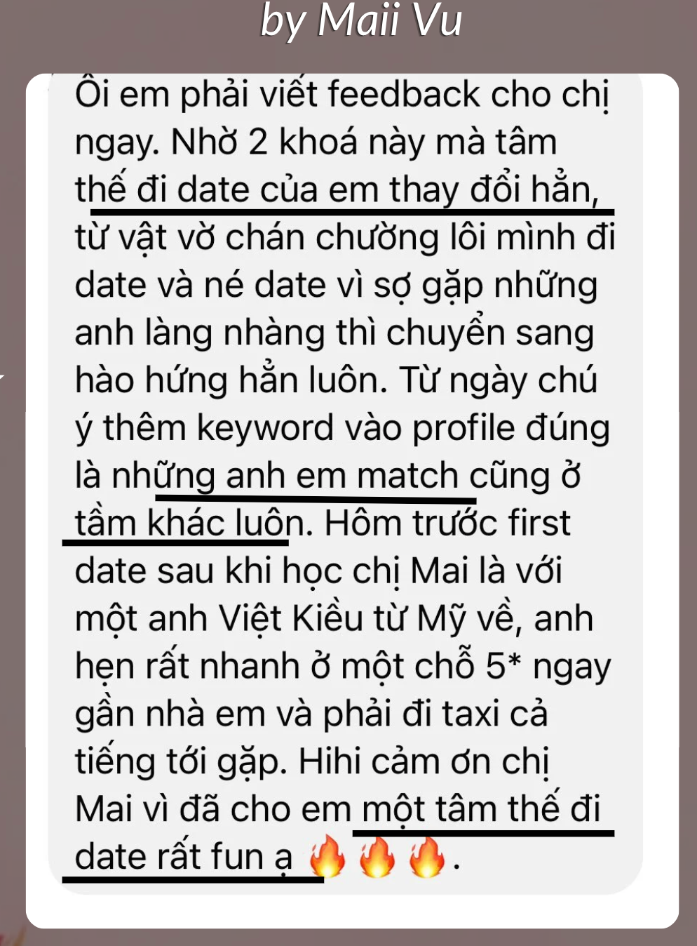 Maii còn rất nhiều bí mật khác về online dating, với những chiến lược thực tế đi từ những bước ban đầu sau khi “Match” được High Value Man thì bạn nên trò chuyện như thế nào, khi gặp gỡ hẹn hò thì nên nói những gì, giúp bạn duy trì sức hấp dẫn, để không bỏ lỡ người đàn ông tuyệt vời mà bạn gặp được.